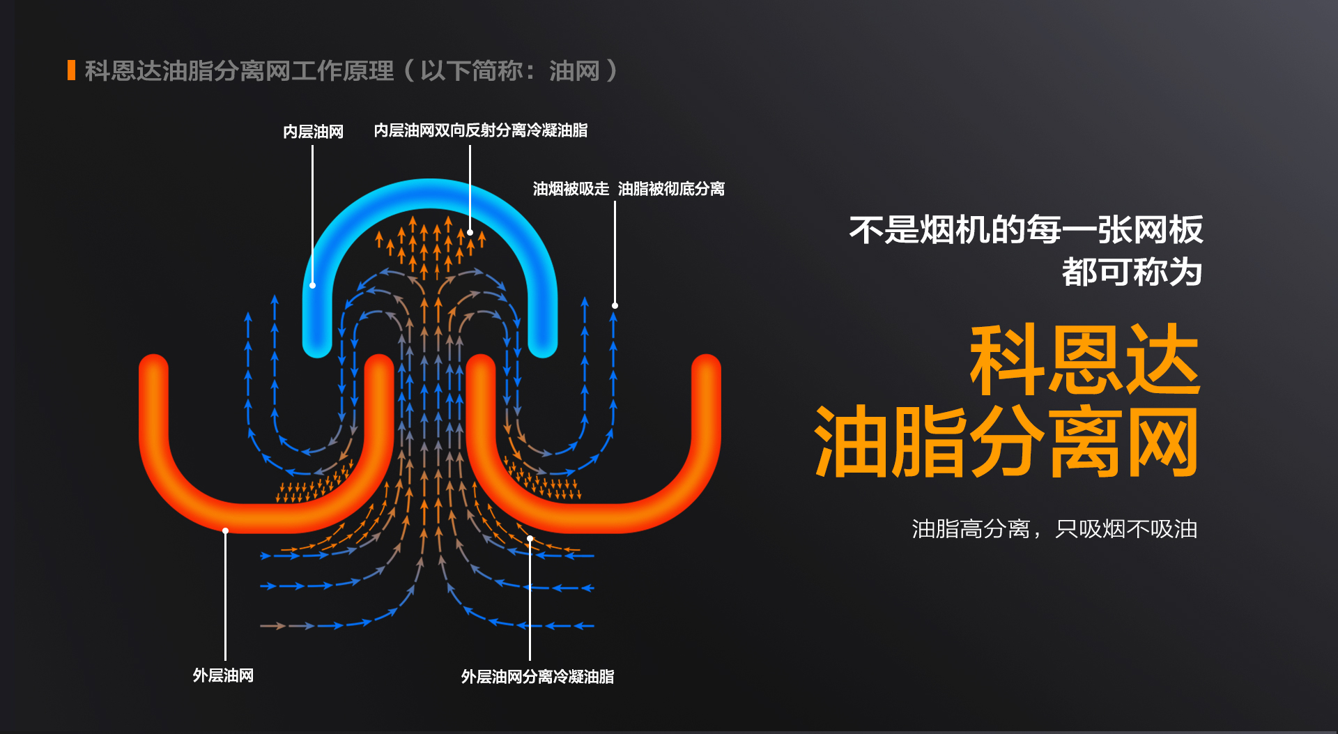 2009年,科恩電器推出行業首塊科恩達網板(又稱科恩達平網),采用單一的不銹鋼或黑晶鋼化玻璃一體材質,其設計簡潔,結構簡單、裝拆方便、清潔省心、濾油效果相對較好。另外,具有節能和降低吸油煙機工作噪音等特點,可廣泛應用于各式家用吸油煙機。