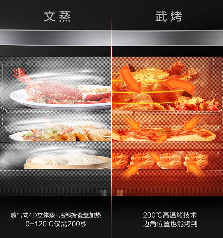 隨著蒸烤一體集成灶走進千家萬戶,消費者卻提出了更高的產(chǎn)品需求。為滿足更多消費者需求,科恩智能蒸烤消一體集成灶除了擁有蒸烤烹飪功能外,還具備了高溫消毒功能,完美突破了單一的烹飪需求。與此同時,科恩智能蒸烤消一體集成灶采用4D立體直噴蒸烤模式,四面受熱均勻,并有多重蒸烤模式選擇,廣域控溫設(shè)計,蒸箱加熱速度一提再提,熱風(fēng)對流立體烘烤色香味俱全,即使多種美食同時烹飪也不串味!有了科恩智能蒸烤消一體集成灶就是有了廚房神器,讓生活更有品味!