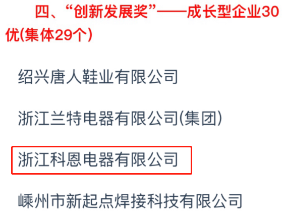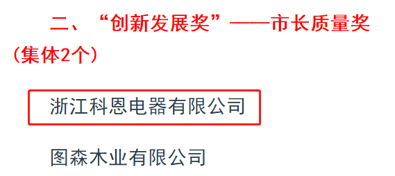 2021年2月10日,嵊州市人民政府發文公布2020年度嵊州市市長質量獎。該獎項由浙江科恩電器有限公司榮獲。獲得該獎項意味著科恩電器有限公司的產品質量取得了政府、專家的一致肯定,在行業內樹起先進的質量標桿形象。