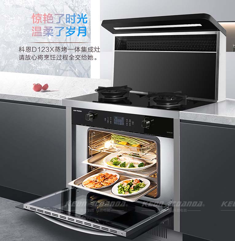 科恩D123X變頻蒸烤消一體智能集成灶為什么頗受消費者的喜愛,原因有以下幾方面:1.省空間:科恩D123X集合煙機、燃?xì)庠睢⒄粝洹⒖鞠洹⑾竟竦榷喾N功能于一體,不僅節(jié)省空間還能省下一米櫥柜空間。2.吸油煙能力強:比起傳統(tǒng)煙機,科恩D123X離灶臺距離更近,吸力更強,在油煙產(chǎn)生的第一時間就可以將其吸走,另外油煙的過濾網(wǎng)采用不沾油特氟龍材料,易清洗、耐高溫、抗腐蝕!3.大火力爆炒:尤其是爆炒菜,D123X鑄鐵鍋架帶雙聚能環(huán)設(shè)計,四通道獨立引射5.0KW大火力猛火爆炒,寬裕立體上進風(fēng)充分燃燒,提高燃燒效率,降低一氧化碳排放。
