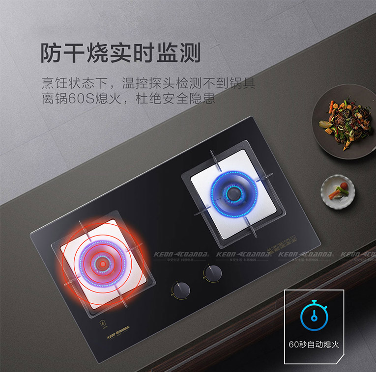 另外,大多數(shù)家在購買廚電的時(shí)候順手買個(gè)燃?xì)庠睿]有專門的去選購一款適合的、安全的燃?xì)庠睢_@就導(dǎo)致了一些家庭的廚房安全沒有辦法得到保障,會(huì)出現(xiàn)燒干鍋、鍋空燃等安全隱患。KN610智能防干燒灶具擁有防干燒裝置功能,左爐頭帶日本進(jìn)口探頭防干燒裝置,意外忘記關(guān)火外出干燒時(shí),將會(huì)自動(dòng)關(guān)火,同時(shí)當(dāng)鍋離開60S時(shí)將自動(dòng)熄火,杜絕了安全隱患!