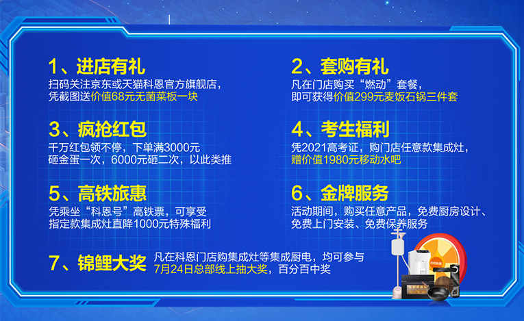 集成灶十大品牌、廚電行業十大品牌科恩燃動七月舌尖之旅——邂逅幸福美味,七大特權享不停,進店有禮:掃碼關注京東或天貓科恩官方旗艦店,憑截圖送價值68元無菌菜板一塊;套購有禮:凡在門店購買“燃動”套餐,即可獲得價值299元麥飯石鍋三件套;瘋搶紅包:千萬紅包領不停,下單滿3000元即可砸金蛋一次,6000元砸二次,以此類推;考生福利:憑2021高考證,購門店任意款集成灶,贈價值1980元移動水吧;高鐵旅惠:憑乘坐“科恩號”高鐵票,可享受指定款集成灶直降1000元特殊福利;金牌服務:活動期間購買任意產品,可享受免費廚房設計、免費上門安裝、免費保養服務;錦鯉大獎:凡在科恩門店購集成灶等集成廚電,均可參與7月24日總部線上抽獎。