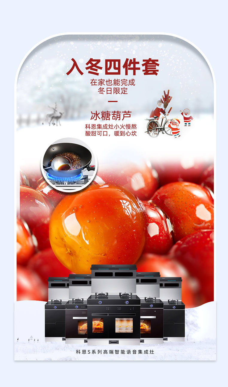 除了有暖呼呼的紅薯和栗子外,當(dāng)然也少不了酸酸甜甜的冰糖葫蘆了,咬開糖葫蘆嘎嘣脆的糖衣,山楂的酸甜涌入,瞬間回到那個無憂無慮的童年,科恩集成灶必須給安排上!