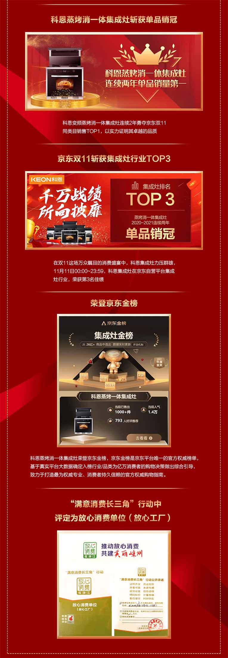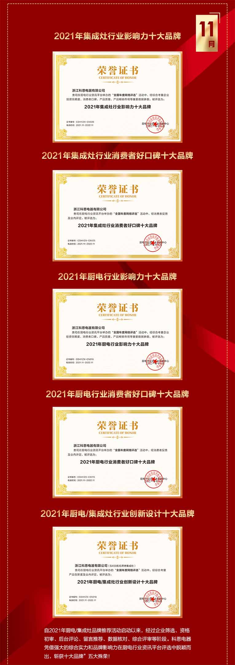 樂享智慧廚房,有著這些榮譽背書,科恩集成灶品質更值得用戶信賴,而科恩也會這些信賴轉化為動力,不斷研發、制造出更優秀的產品。