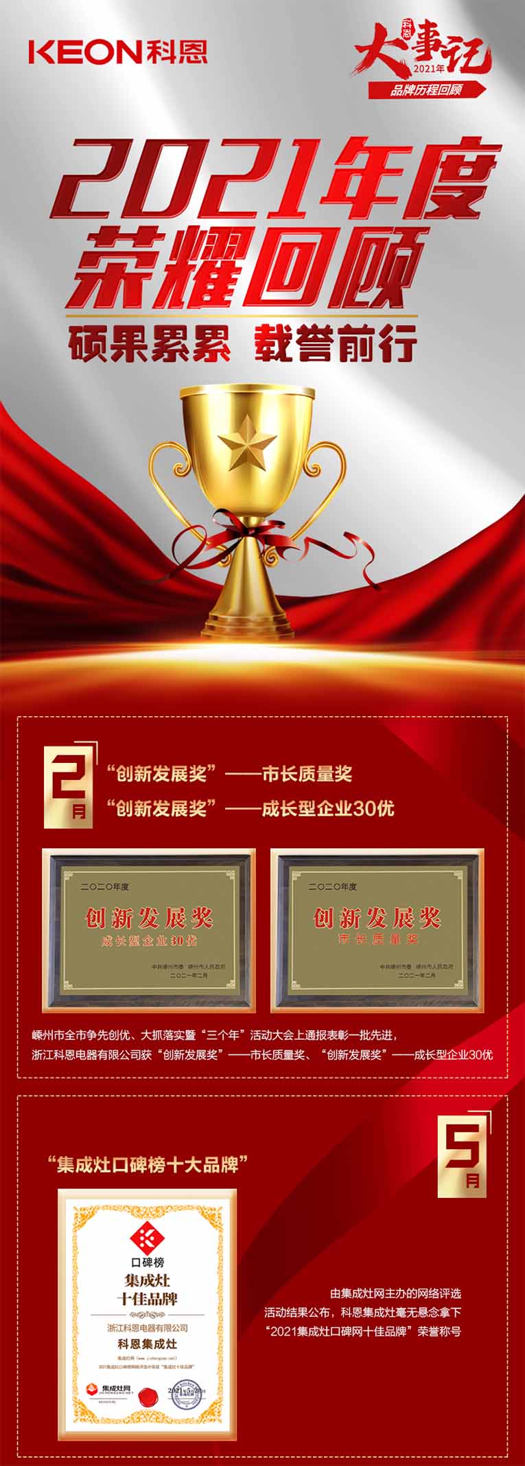 集成灶已成為廚電行業的明星產品,其高速的市場增長率和極高的好評度,不僅展現了其本身性能的卓著,而且顯示出集成廚電行業明朗開闊的前景,科恩集成灶奮勇前行,憑借強大的企業實力、雄厚的技術支持、可靠的售后服務,成為了眾多消費者的首選,2021年是科恩集成灶飛速發展的一年。這一年,科恩“五新戰略”發布、這一年,斥資800萬全國高鐵冠名、這一年,科恩斬獲眾多榮譽。