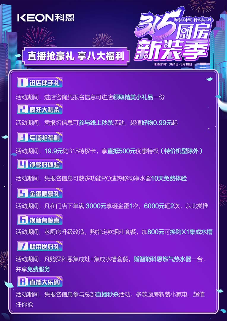 廚房新國潮,科恩新三件~科恩集成灶315廚房新裝季,八大特權(quán)限時大放送!!一進(jìn)店伴手禮,活動期間進(jìn)店資訊憑報名信息可領(lǐng)取精美小禮品一份;二瘋狂大秒殺,憑報名信息可參與線上秒殺活動,超值好物0.99元起;三專場搶福利,活動期間19.9元購315特權(quán)卡,享直抵500元特惠特權(quán)(特價機芯除外);四凈享好體驗,活動期間憑報名信息可獲多功能RO速熱移動凈水器10天免費體驗;五金蛋砸豪禮,活動期間凡在門店下單滿3000元享砸金蛋1次,6000元砸2次,以此類推;六換新有驚喜,活動期間老廚房升級改造,購指定款煙灶套餐,加800元可換購X1集成水槽;七聯(lián)帶送好禮,活動期間凡購買科恩集成灶+集成水槽套餐,贈智能科恩燃?xì)鉄崴饕慌_,并享免費服務(wù);八直播大樂購,活動期間憑報名信息參與總部直播秒殺活動,多款廚房新裝小家電,超值任你搶!