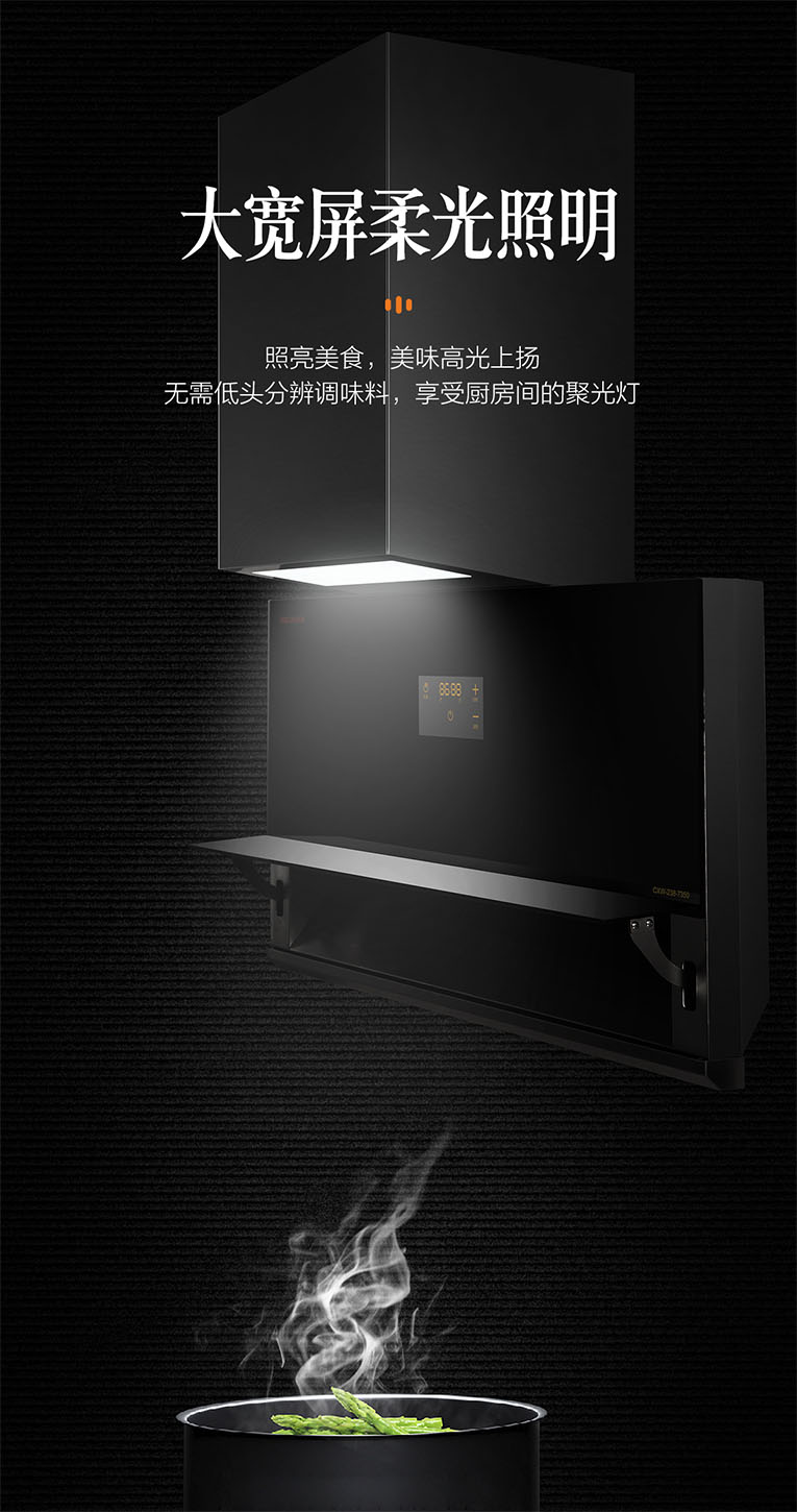 上方采用大寬屏柔光照明,發(fā)光均勻無(wú)暗影,照亮美食,美味高光上揚(yáng),無(wú)需低頭分辨調(diào)味料,享受廚房間的聚光燈。