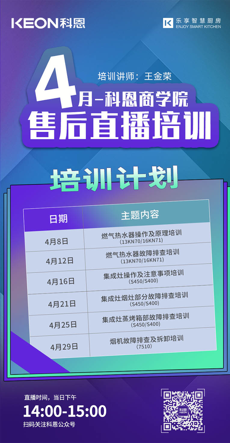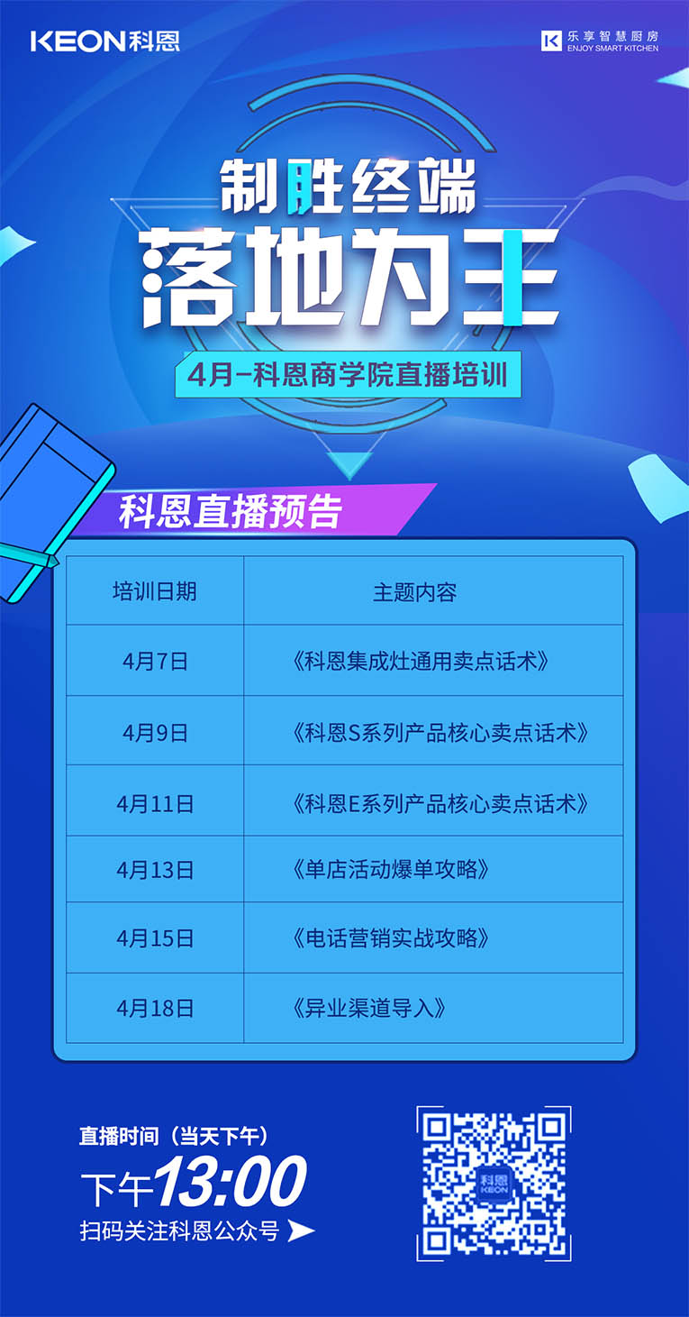 勤修內(nèi)功,強化技能,提升自我!集成灶十大品牌、廚電行業(yè)十大品牌科恩集成灶4月線上直播培訓總覽,儲備知識,保障團隊凝聚力和戰(zhàn)力力,上下齊心,打造黃金團隊,擴大品牌影響力!