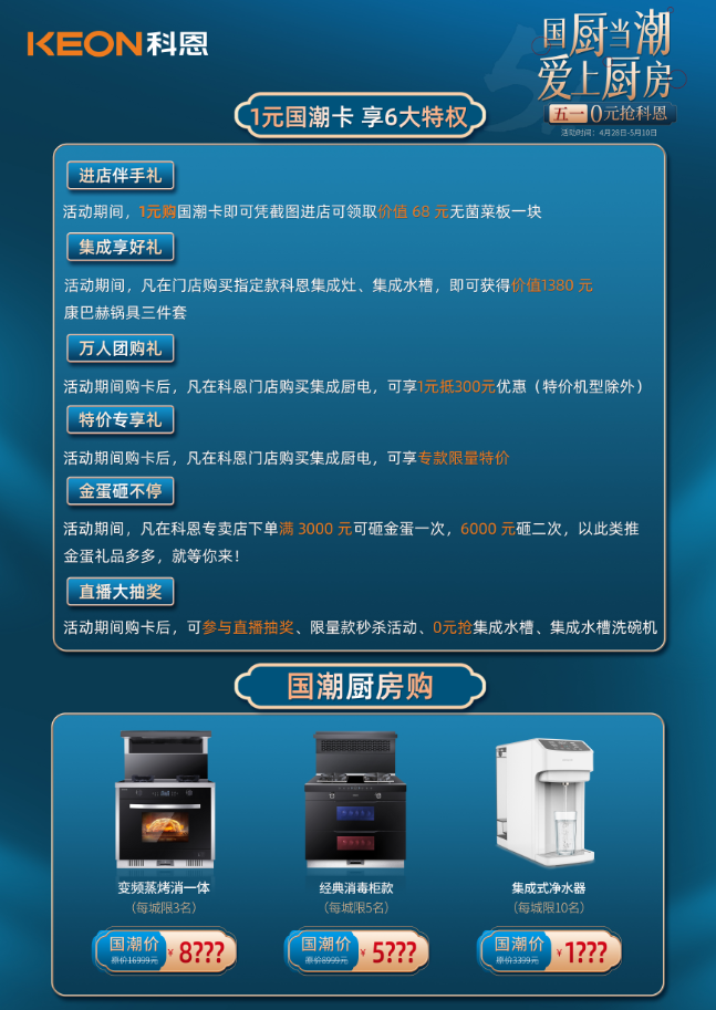 凡是購買1元國潮卡的用戶即可參與直播大抽獎活動:無菌菜板、PP棉濾芯、便攜榨汁杯、凈水龍頭、章丘鐵鍋、康巴赫鍋具三件套、集成水槽、集成水槽洗碗機...海量壕禮發(fā)不停!!!活動精彩紛呈,直播間也熱鬧非凡,全國各地的朋友們積極參與,用指尖傳遞著國廚當潮,愛上廚房的精致廚房新理念。