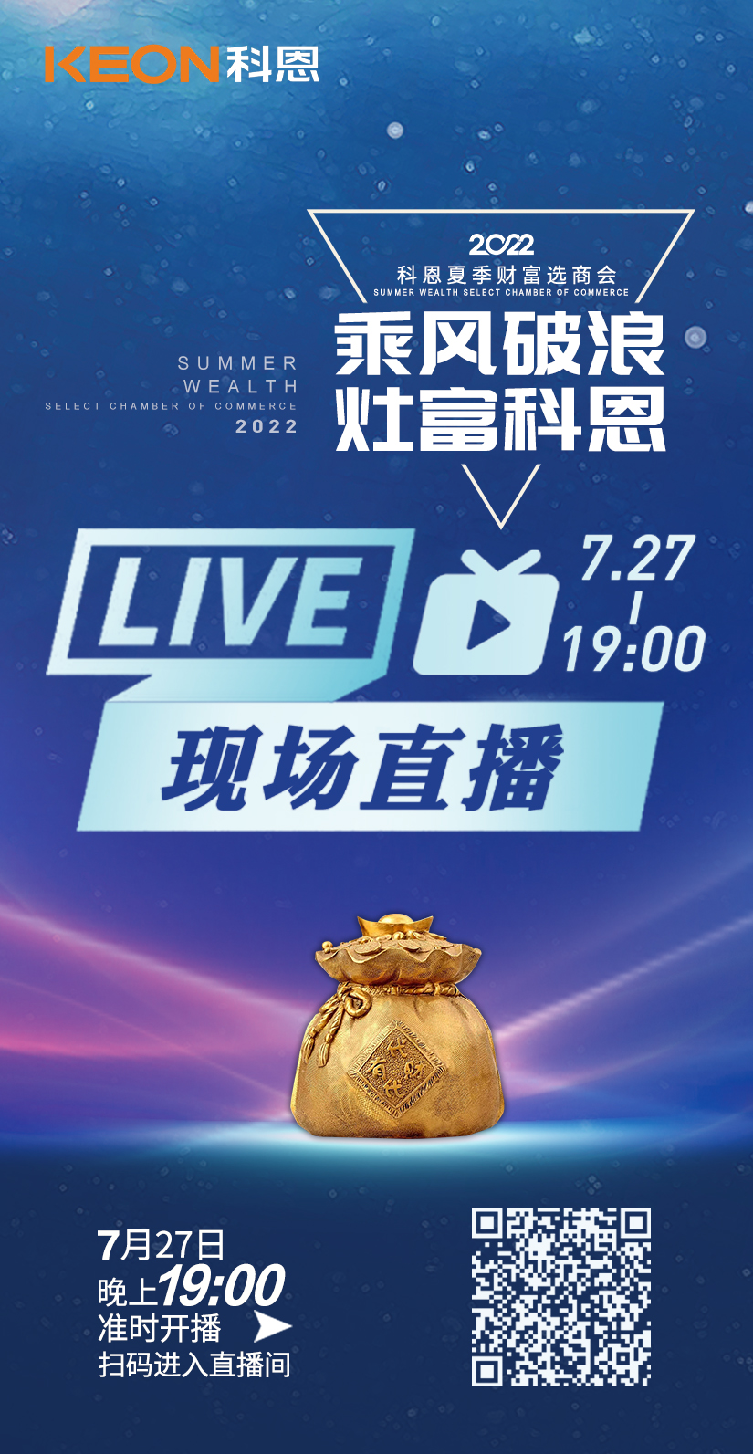 乘風破浪·灶富科恩2022科恩夏季財富選商會進入倒計時1天,鑒于疫情呈多點散發多地頻發的形式,科恩電器將于7.27晚19時召開全國直播線上選商會,用直播打破地域局限,“0距離”交流,足不出戶亦能覓得良機!