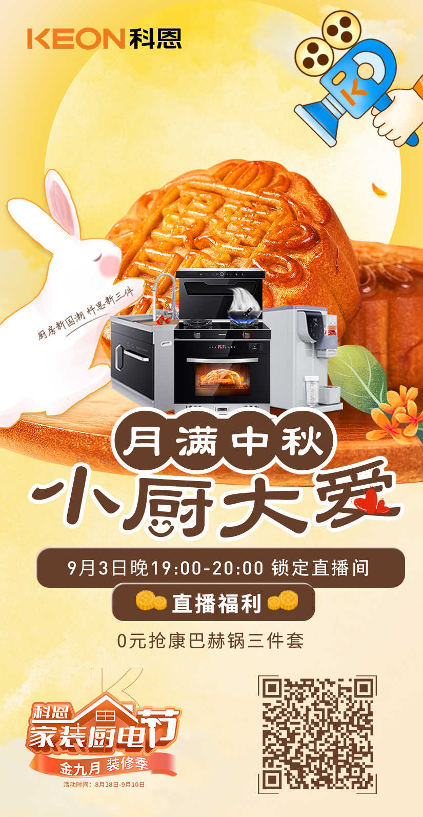 金九月·裝修季——科恩家裝廚電節【月滿中秋 | 小廚大愛】第二期月餅DIY直播將于9月3日晚7點準時開播,鎖定科恩直播間,提前購1元廚電美食卡獲抽獎資格一起來看直播做美食中大獎吧!
