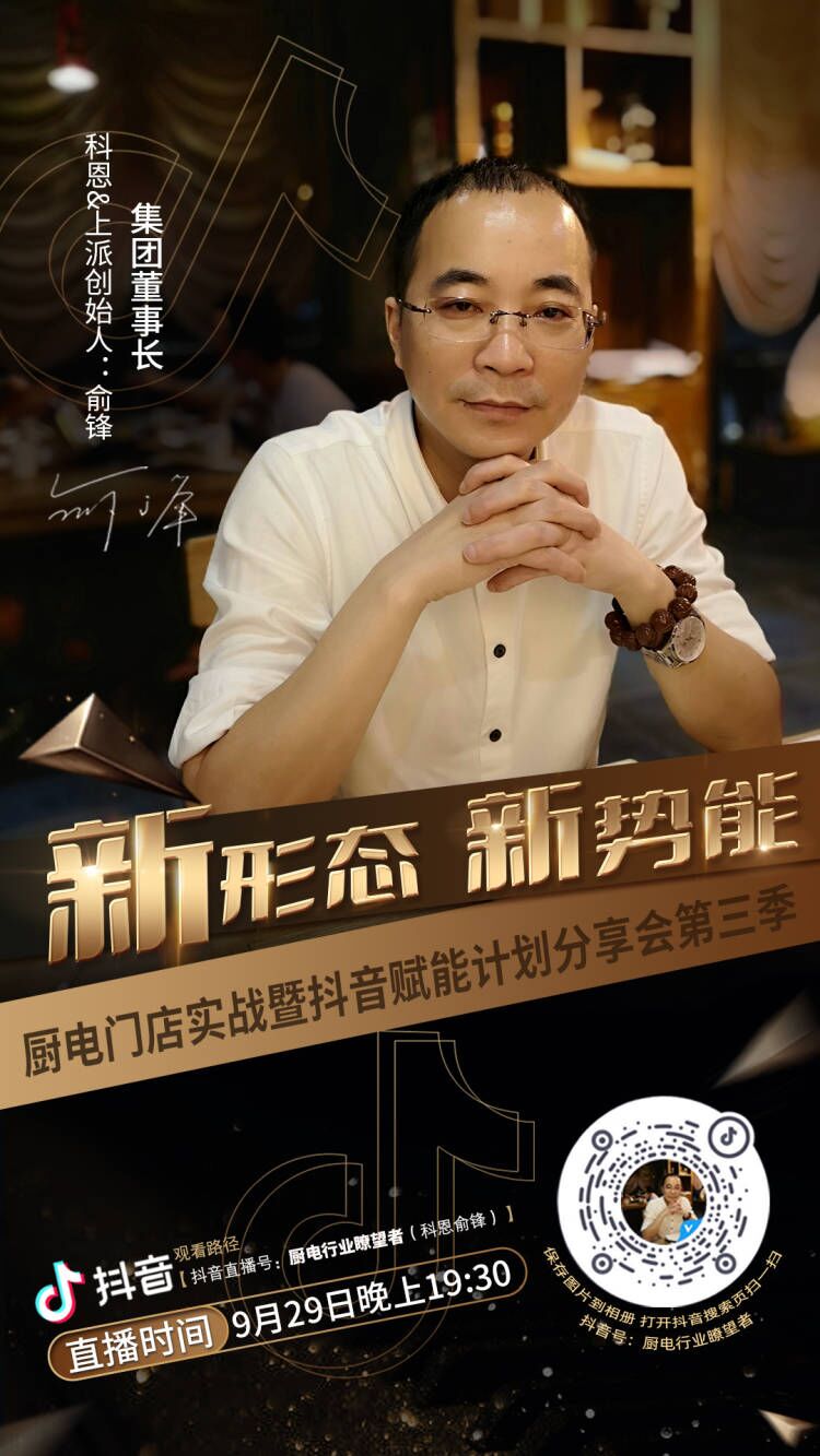集團(tuán)董事長、科恩&上派創(chuàng)始人俞鋒親自領(lǐng)軍征戰(zhàn)新零售流量變現(xiàn)風(fēng)口,科恩新媒體事業(yè)中心資深團(tuán)隊導(dǎo)師護(hù)航,助力廚電行業(yè)實體店打造線上引流線下獲客的私域裂變!9月29日19:30, 鎖定抖音直播間,董事長俞鋒親自掛帥,為您傾情分享新形態(tài)下實體店聚勢掘金新勢能!