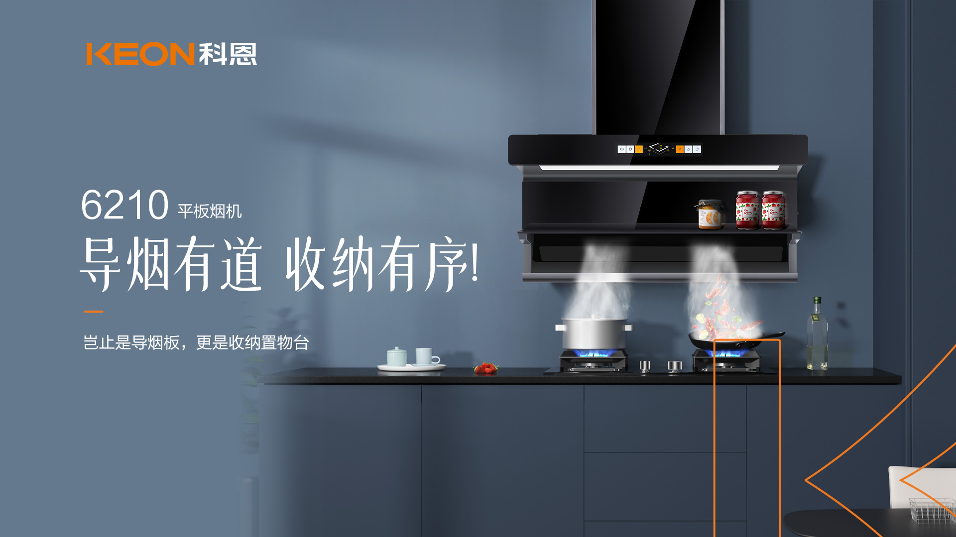 科恩平板煙機6210降低吸煙距離,采取低空爆吸,20m3/min颶風吸力,讓油煙在鍋口就被吸走!辣味不嗆鼻,妝容不油膩,煥新廚房清新空氣!