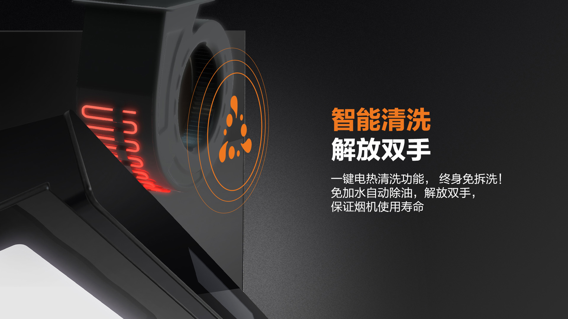 輕輕一按,開啟自動電加熱清洗,免加水自動除油,解放雙手,保證煙機使用壽命!