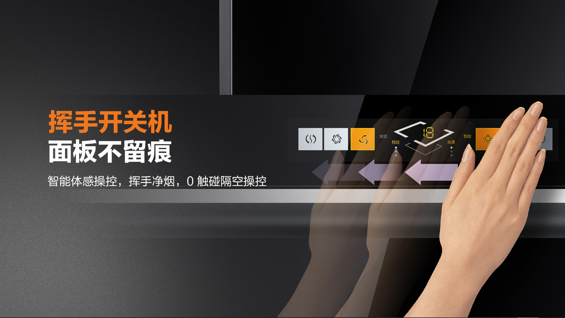 揮手開關(guān)機,面板不留痕,智能體感操控,揮手凈煙,0觸碰隔空操控,廚房更潔凈!