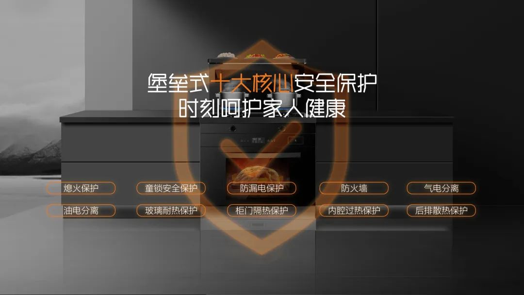 熄火保護、童鎖安全保護、防漏電保護、防火墻、氣電分離、油電分離、玻璃耐熱保護、柜門隔熱保護、內腔過熱保護 、后排散熱保護。廚房安全無小事,從每個烹飪細節做起,保護廚房烹飪安全!