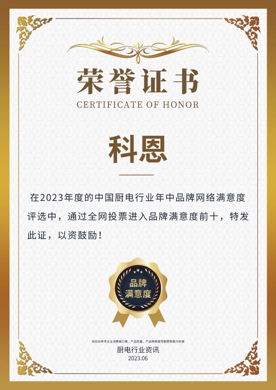 本次榮獲2023年度中國廚電行業品牌年中網絡滿意度前十”、2023年度中國集成灶行業品牌年中網絡滿意度前十”,再次印證了行業及消費者對科恩的認可,未來科恩將繼續秉持初心以產品為原點,深耕行業。以為中國家庭打造智慧廚房生活,及推動中國廚電行業發展繼續前行!