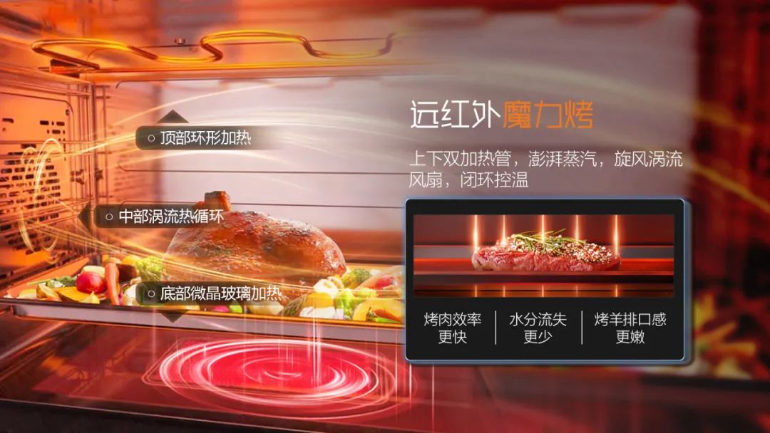 立體勻烤:頂部環形加熱管+循環風機+底部隱形加熱管,360度無死角烤制讓食材均勻受熱外酥里嫩烤的更專業。