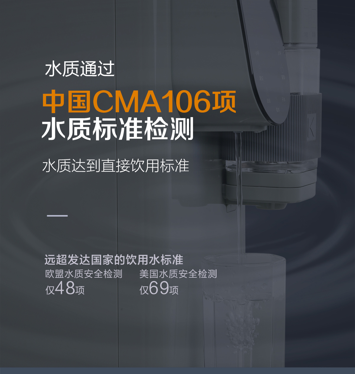 科恩R6068移動水吧,采用RO四膜七級精濾技術,搭載UV抑菌功能,水質通過中國CMA106項水質標準檢測,遠超發達國家的飲用水標準(歐盟水質安全檢測僅48項、美國水質安全檢測僅69項)。