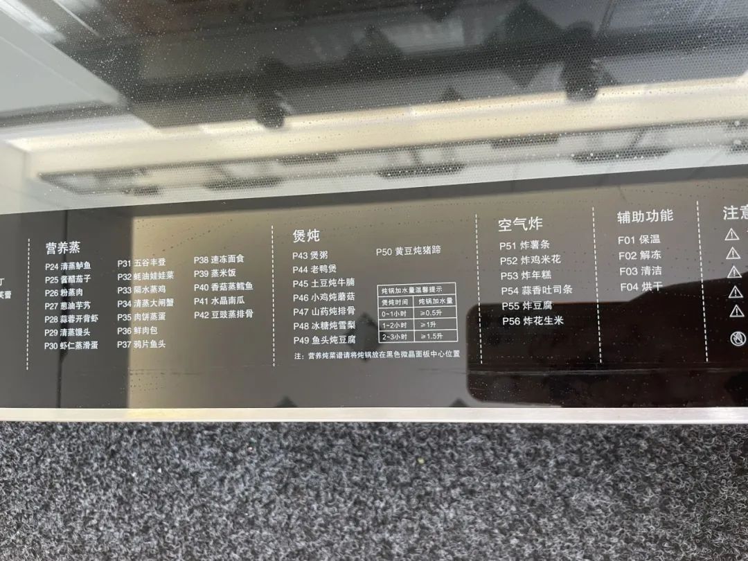 在蒸箱門板上我們能看到有56道菜肴,內(nèi)置菜譜,可一鍵開啟相應(yīng)的蒸烤炸燉功能,無需調(diào)節(jié)時間、溫度,即使小白也能當大廚。