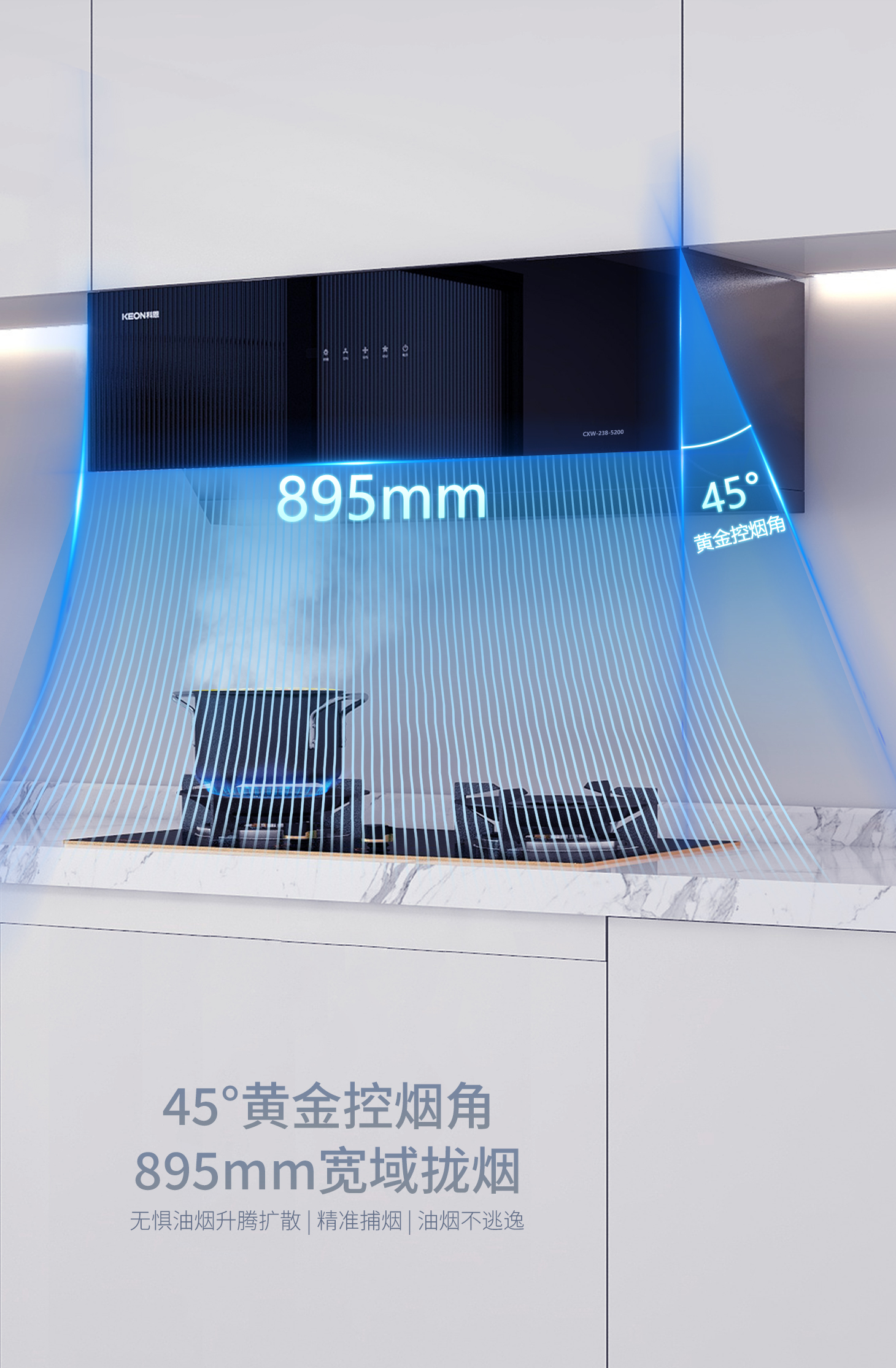 同時,5200特有的45°黃金吸煙角,輕松阻絕油煙上升可能,搭配23m³/min颶風(fēng)吸力,徹底告別了油煙飄散的煩惱,輕松打造無煙廚房。