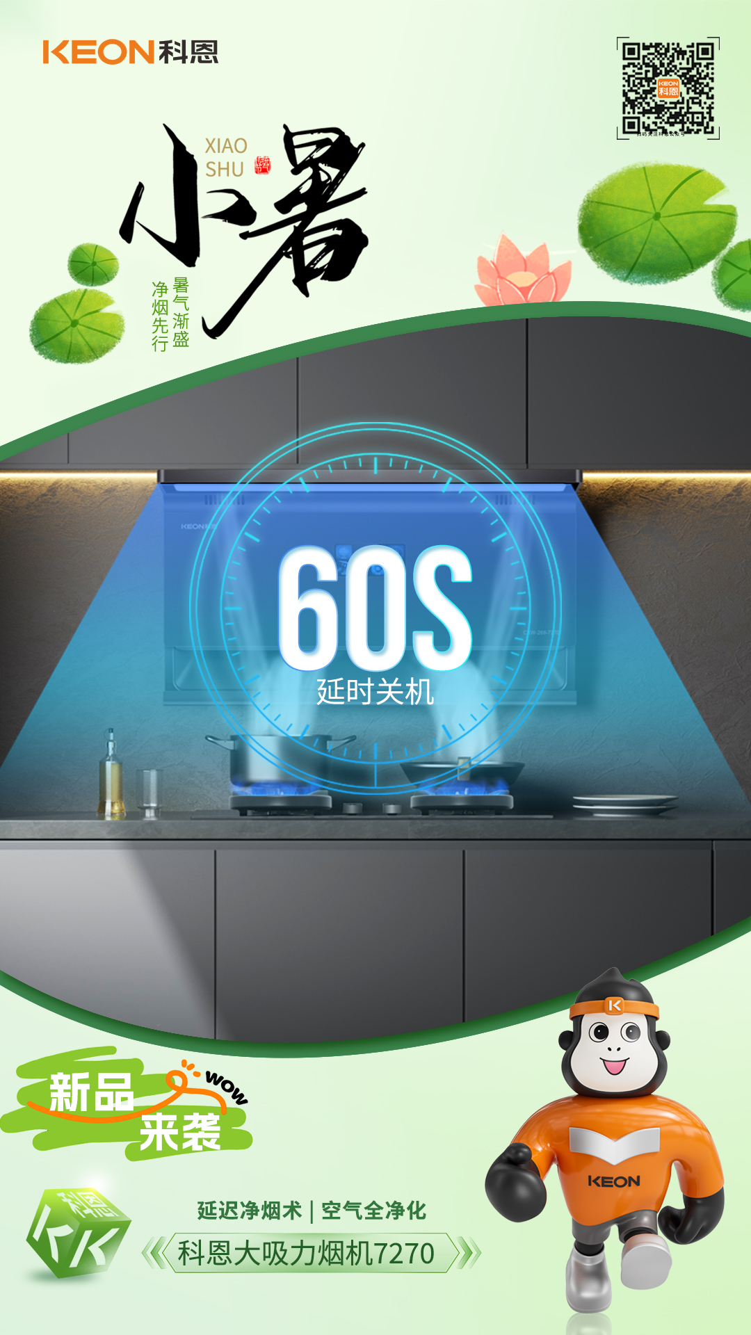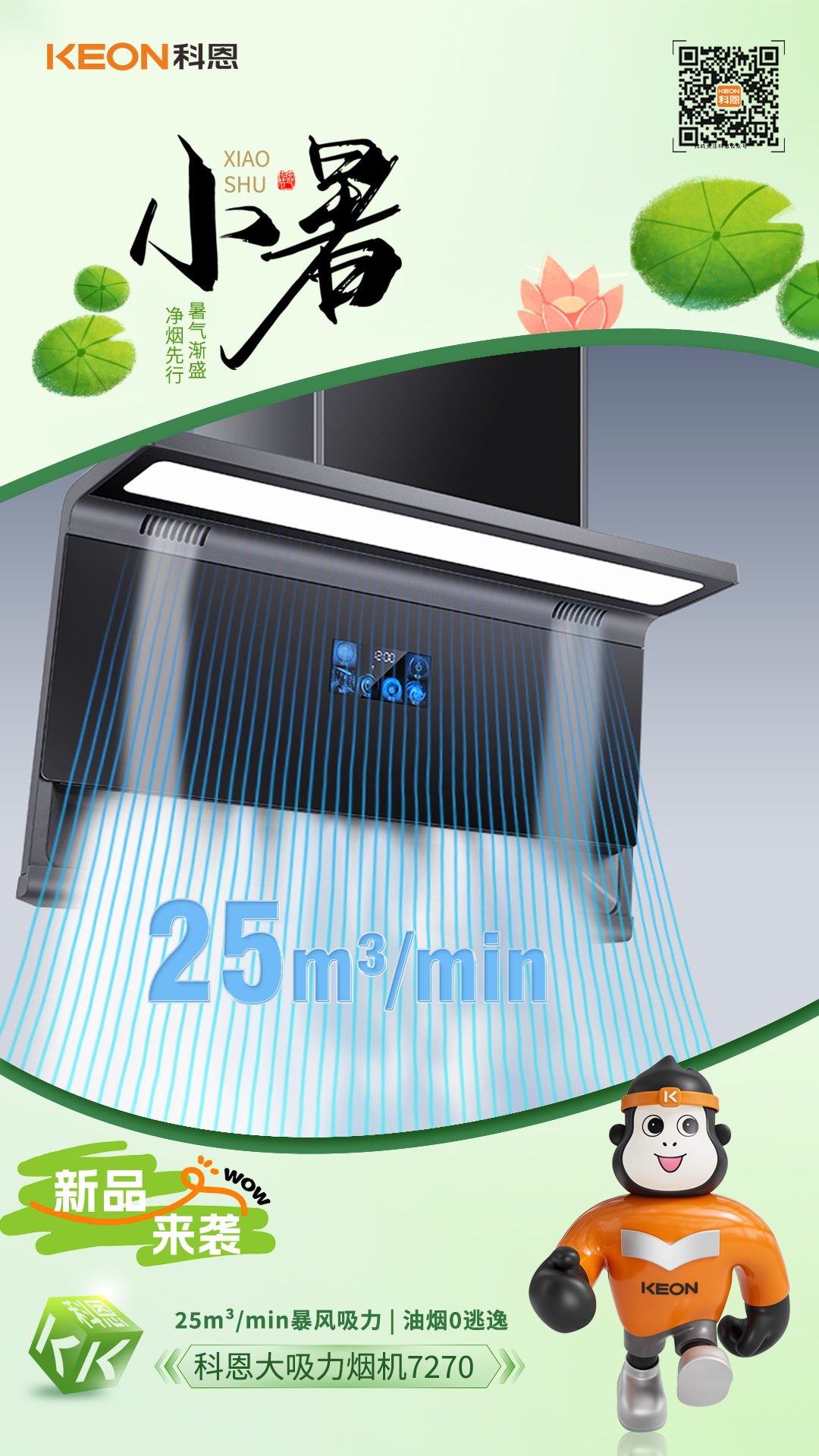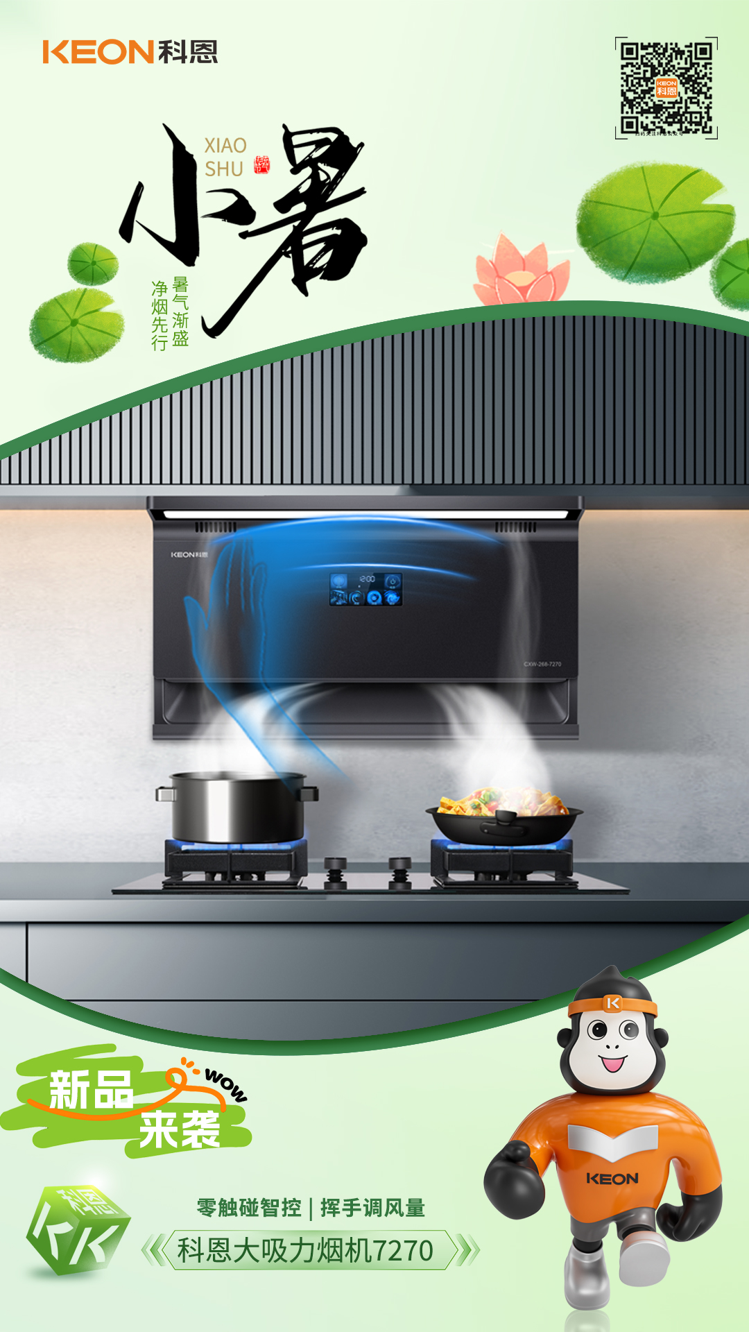 凈煙守護,暑夏清涼從凈煙到清潔,從性能到顏值,科恩7270煙機用硬核實力重塑烹飪體驗。讓爆炒的煙火氣,化作生活的詩情畫意,讓每一次下廚,都成為清涼愜意的慢時光!
