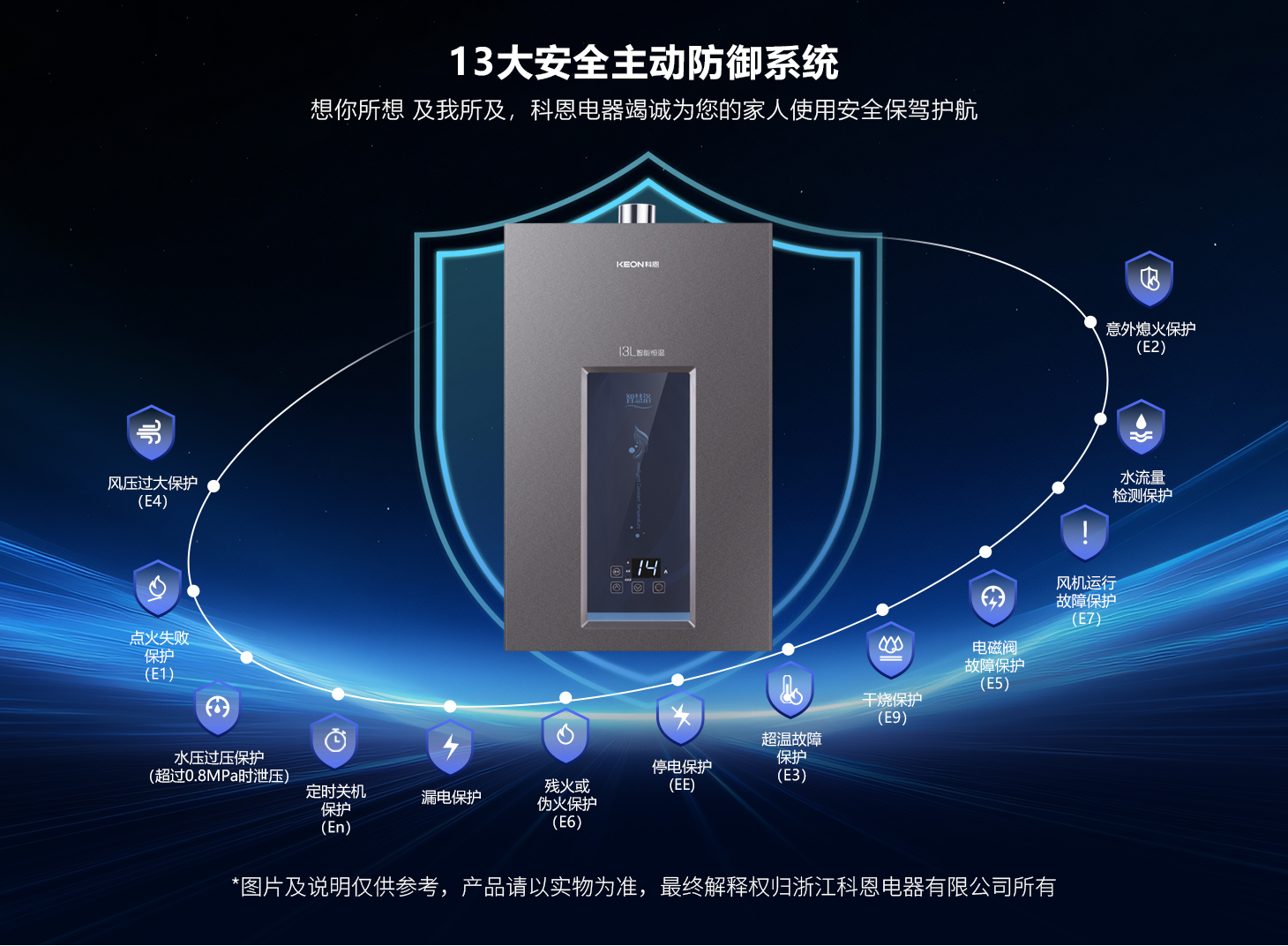 靜音節能,綠色安心智能分段燃燒技術,讓沐浴始終宜人,風機低速運行超靜音享受寧靜的沐浴體驗熱效率高達89%以上,節能更環保老房高層也能暢享穩定熱水十三重護,安全無憂13重全天候安全保障守護全家溫暖過熱、過壓、熄火保護三重防護意外停電或煙道堵塞時自動斷氣定時關機保護,蜂鳴提⽰及報警功能全面杜絕安全隱患,專注享受沐浴無后顧之憂。