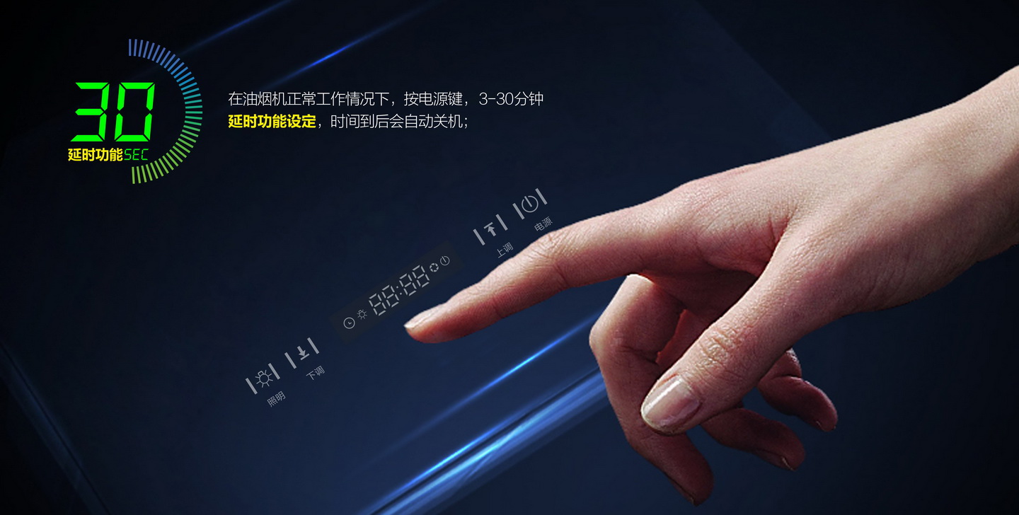 - 在油煙機(jī)正常工作情況下,按電源鍵,時(shí)間到后會(huì)自動(dòng)關(guān)機(jī)。