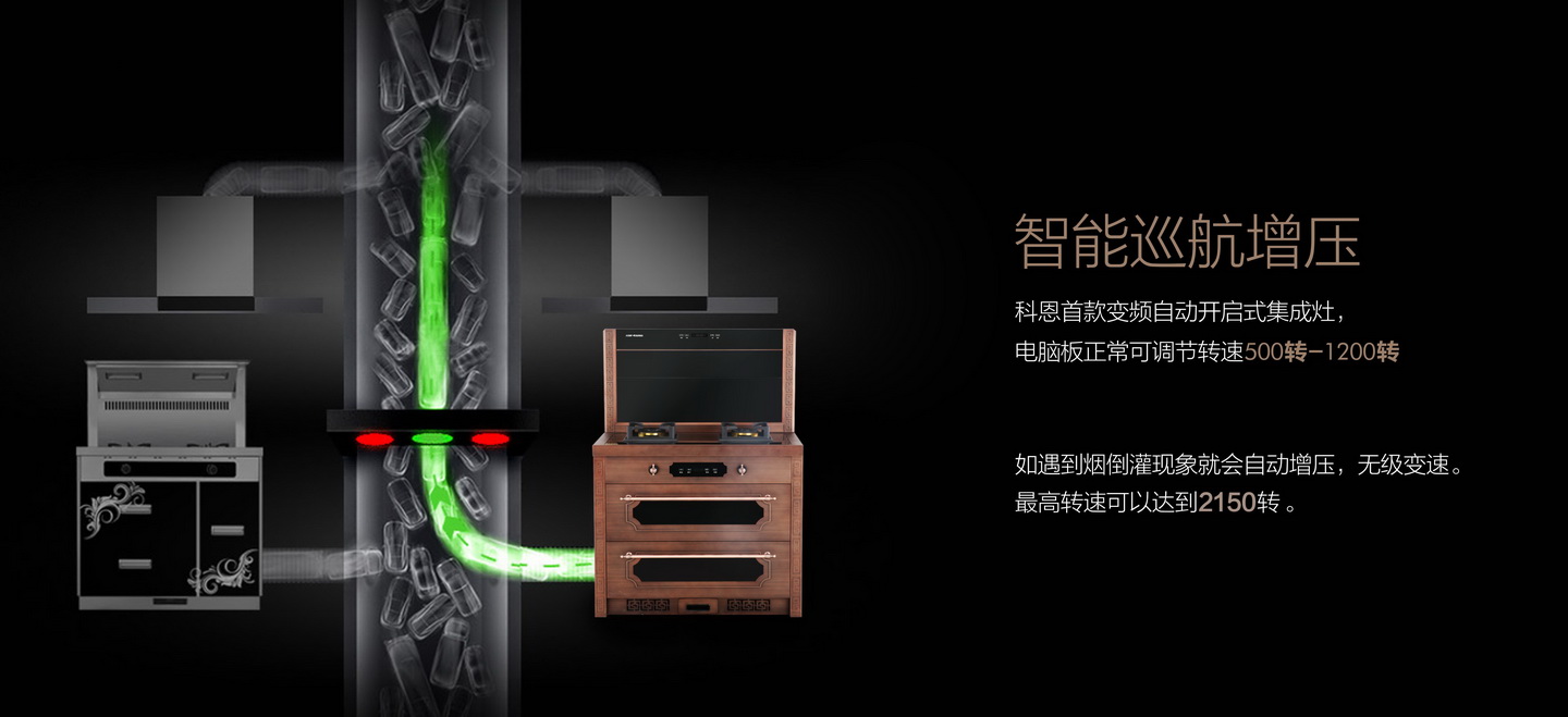 - 科恩首款變頻自動(dòng)開(kāi)啟式集成灶,無(wú)級(jí)變速。