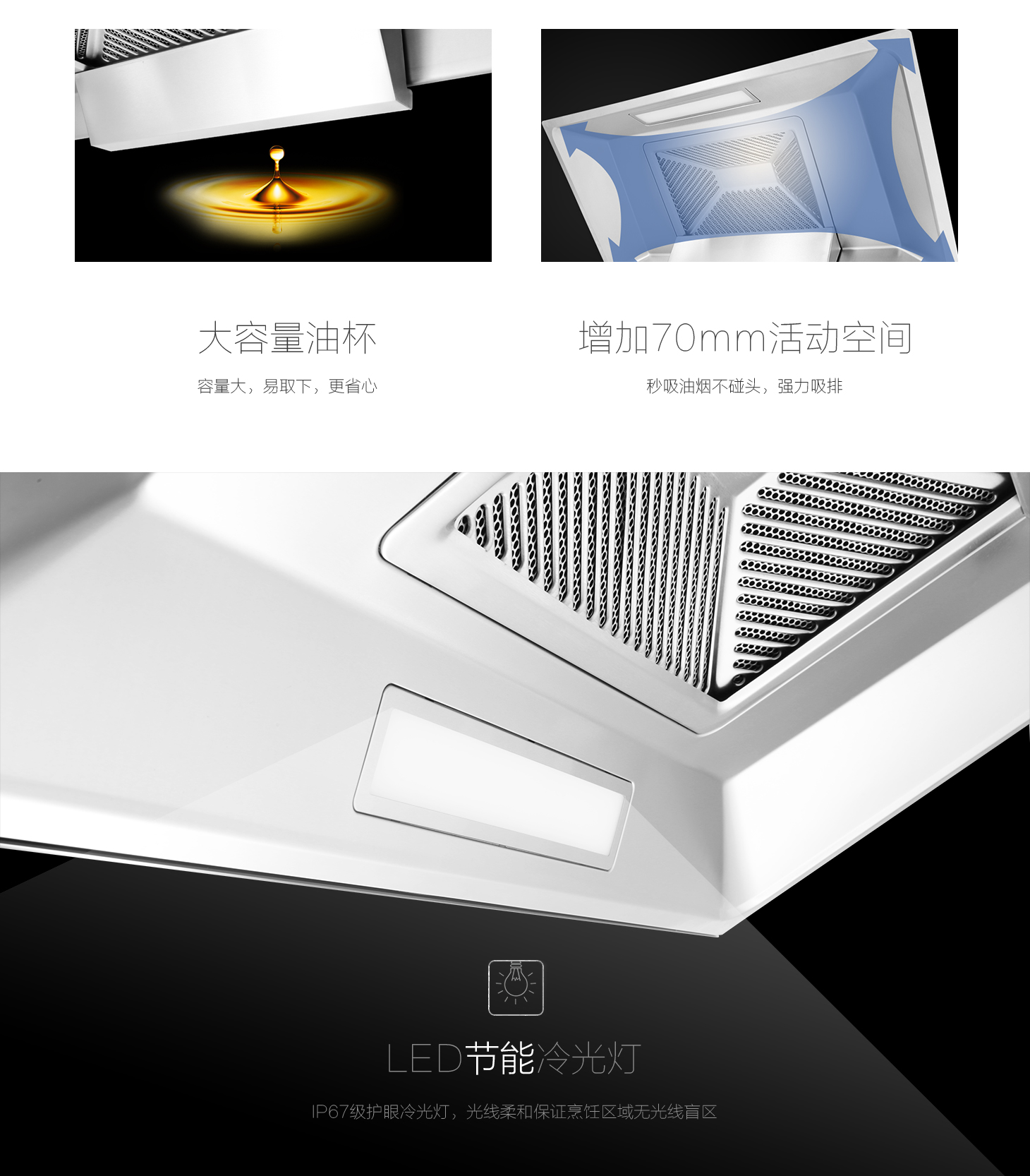 雙層疊排錐形凈濾網,導油分離油煙更徹底。