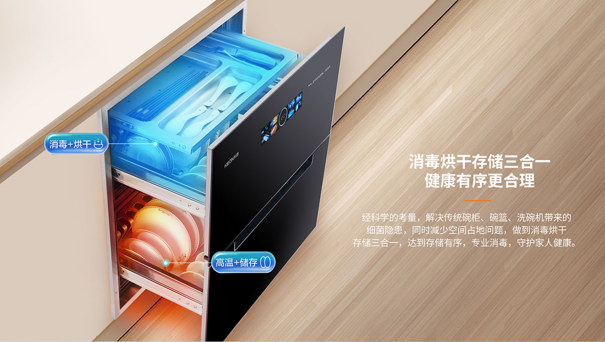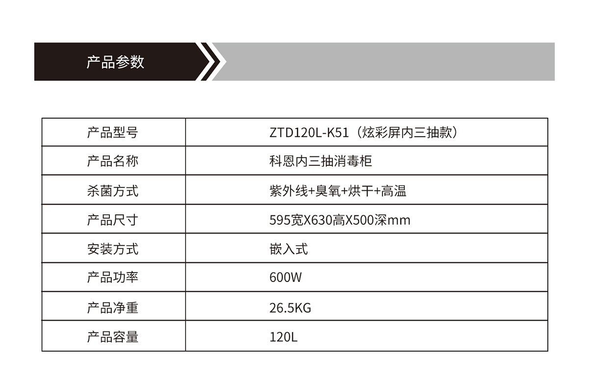 產(chǎn)品型號:ZTD120L-K51(炫彩屏內三抽款)產(chǎn)品名稱:科恩內三抽消毒柜