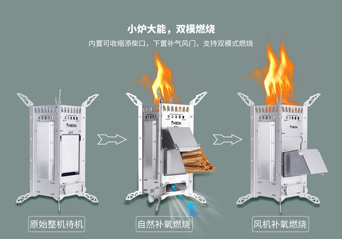 內置可收縮添柴口,下置補氣風門,支持雙模式燃燒