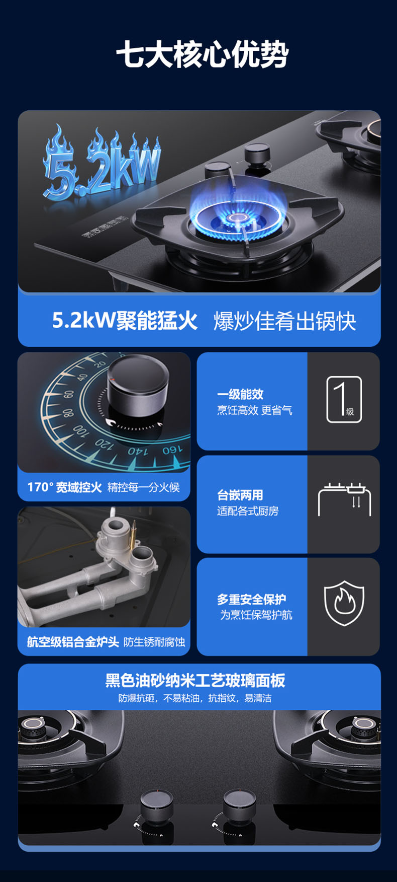 - 無極寬域調(diào)火,0°-170° 隨心掌控,火候自如